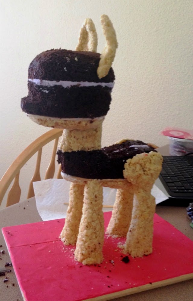 I used a dense-ish double chocolate cake (which tasted amazing) for the body and head, since they're the biggest parts. I then used rice crispy treats for the legs, neck, and ears, and I also used them for the bottom of the body and head.